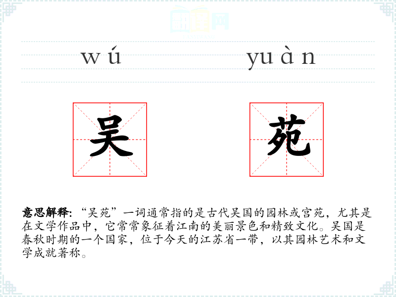 在文学语境中,“吴苑”常被用来描绘江南的风景,如诗句“吴苑春如绣”(吴苑的春天如同绣品一般美丽)。在口语中,这个词可能不太常用,但在讨论**古代文化和历史时,它可能会被提及。在专业领域,如园林设计或历史研究中,“吴苑”可能被用来指代特定的历史园林或其设计风格。