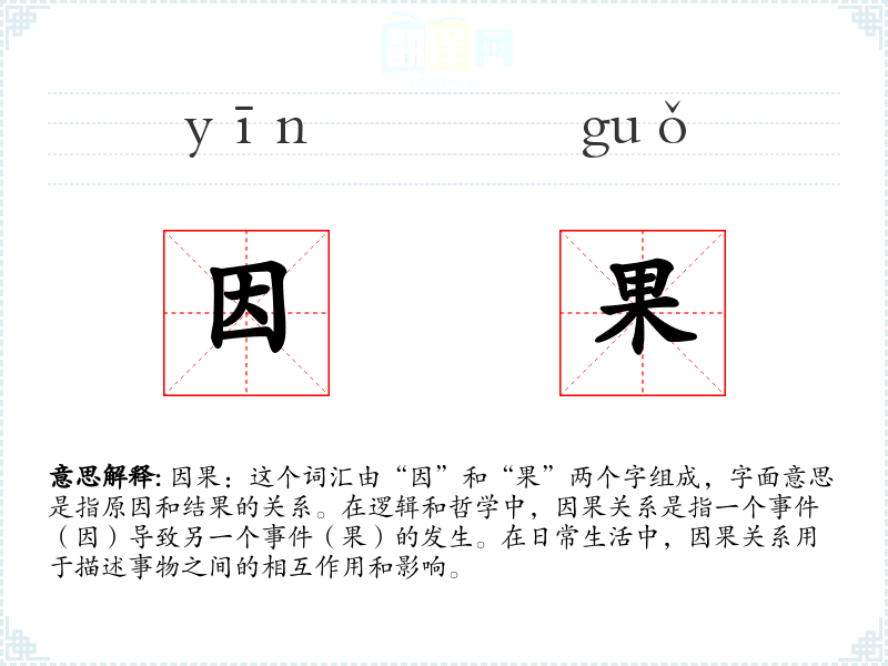 因果:这个词汇由“因”和“果”两个字组成,字面意思是指原因和结果的关系。在逻辑和哲学中,因果关系是指一个(因)导致另一个(果)的发生。在日常生活中,因果关系用于描述事物之间的相互作用和影响。