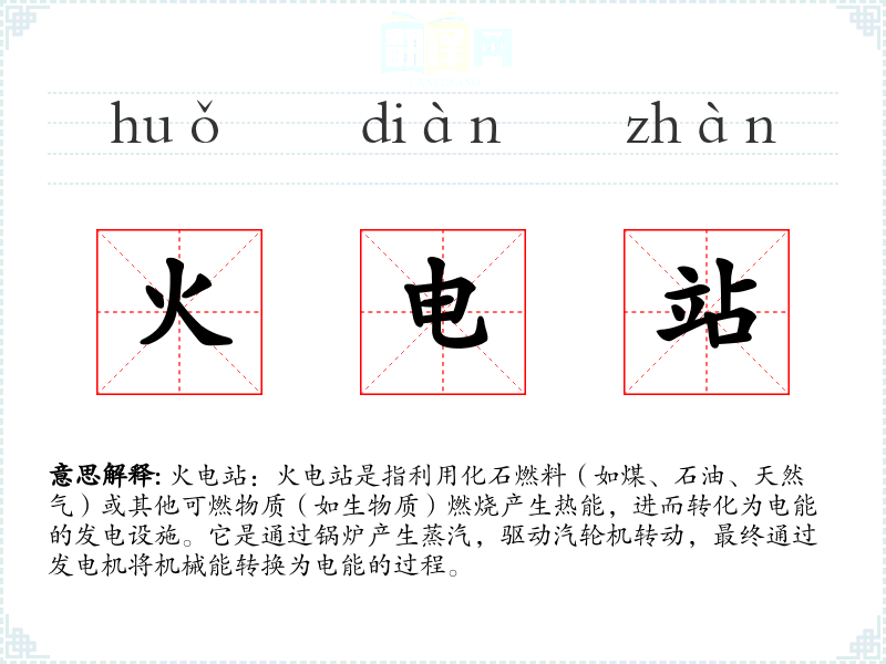 - 词源:火电站一词源于对发电方式的描述,即通过燃烧产生热能并转化为电能。
