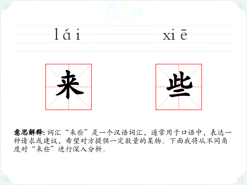 - 同义词:“来点”、“来一些”、“来几”等,这些词汇在语义上与“来些”相似,但在语气和用法上可能略有不同。