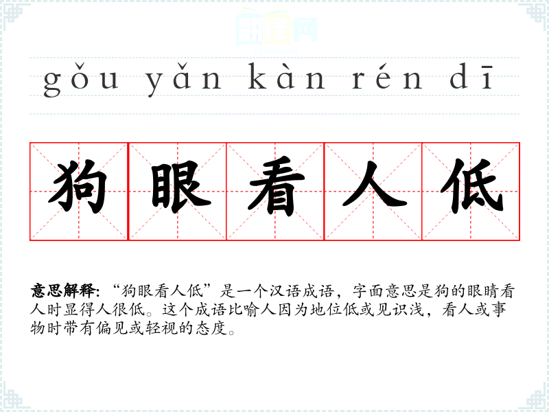 “狗眼看人低”是一个汉语成语,字面意思是狗的眼睛看人时显得人很低。这个成语比喻人因为地位低或见识浅,看人或事物时带有偏见或轻视的态度。