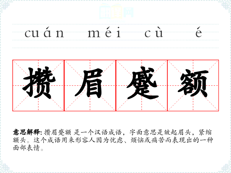 攒眉蹙额 是一个汉语成语,字面意思是皱起眉头,紧缩额头。这个成语用来形容人因为忧虑、烦恼或痛苦而表现出的一种面部表情。