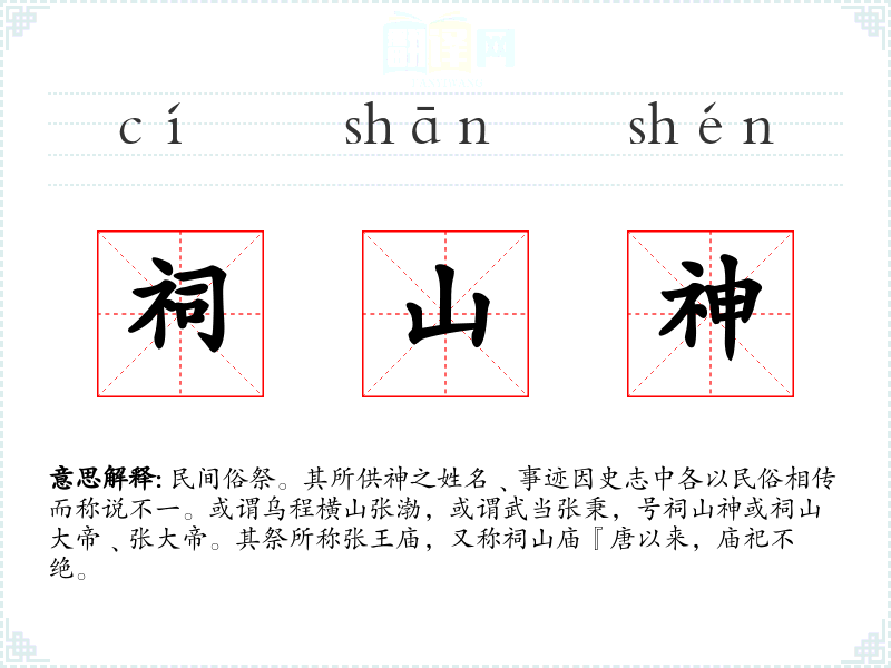 民间俗祭。其所供神之姓名﹑事迹因史志中各以民俗相传而称说不一。或谓乌程横山张渤,或谓武当张秉,号祠山神或祠山大帝﹑张大帝。其祭所称张王庙,又称祠山庙『唐以来,庙祀不绝。