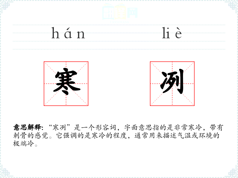 “寒冽”是一个形容词,字面意思指的是非常寒冷,带有刺骨的感觉。它强调的是寒冷的程度,通常用来描述气温或环境的极端冷。