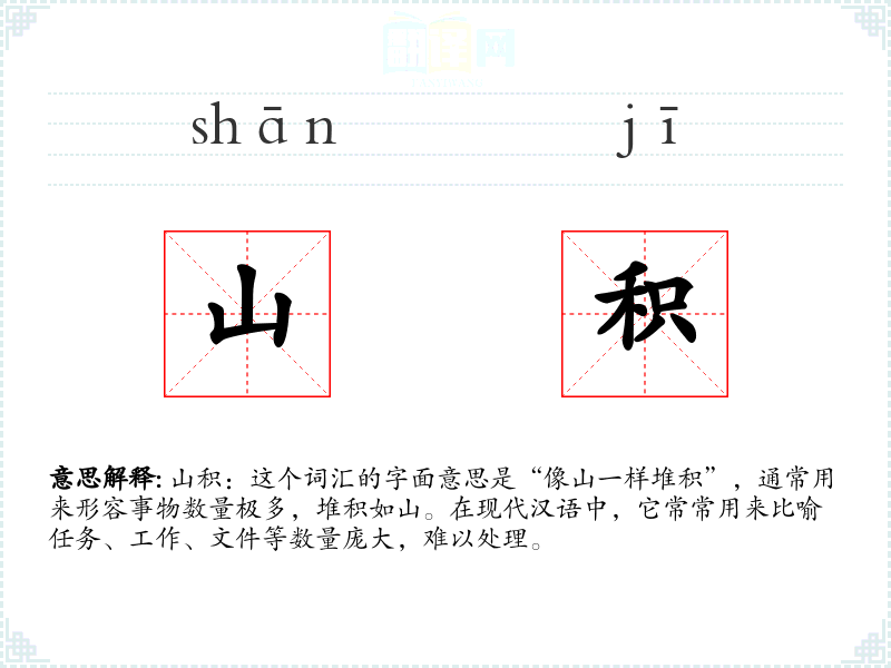 山积:这个词汇的字面意思是“像山一样堆积”,通常用来形容事物数量极多,堆积如山。在现代汉语中,它常常用来比喻任务、工作、文件等数量庞大,难以处理。