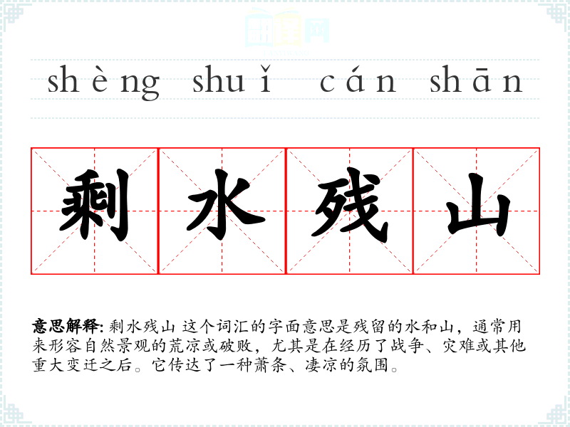 剩水残山 这个词汇的字面意思是残留的水和山,通常用来形容自然景观的荒凉或破败,尤其是在经历了战争、灾难或其他重大变迁之后。它传达了一种萧条、凄凉的氛围。