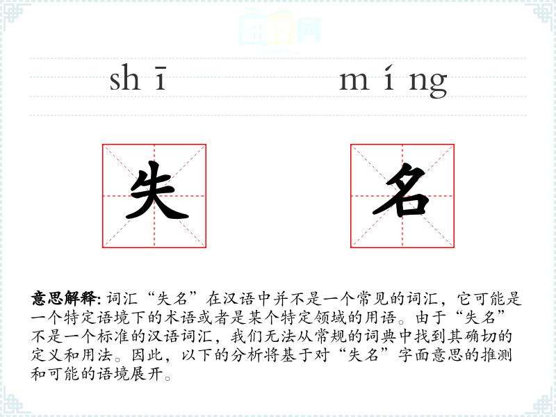 词汇“失名”在汉语中并不是一个常见的词汇,它可能是一个特定语境下的术语或者是某个特定领域的用语。由于“失名”不是一个标准的汉语词汇,我们无法从常规的词典中找到其确切的定义和用法。因此,以下的分析将基于对“失名”字面意思的推测和可能的语境展开。