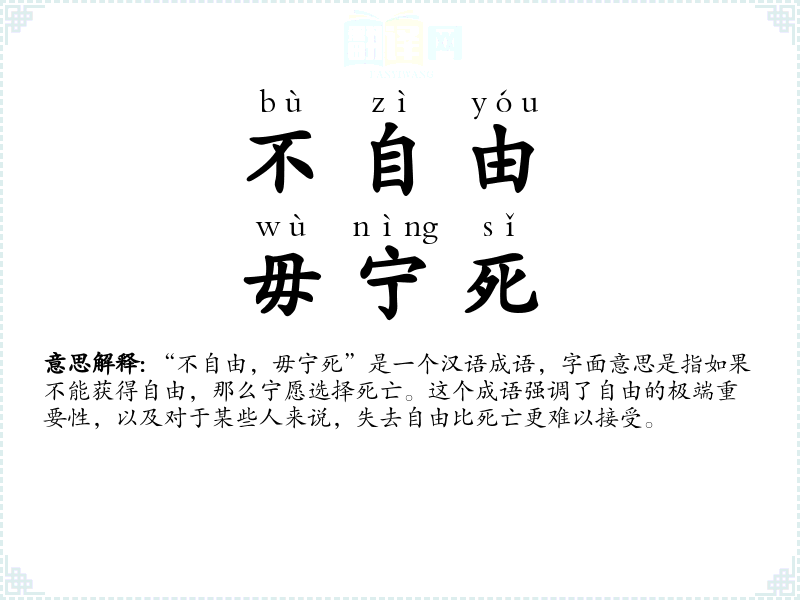 “不自由,毋宁死”是一个汉语成语,字面意思是指如果不能获得自由,那么宁愿选择死亡。这个成语强调了自由的极端重要性,以及对于某些人来说,失去自由比死亡更难以接受。