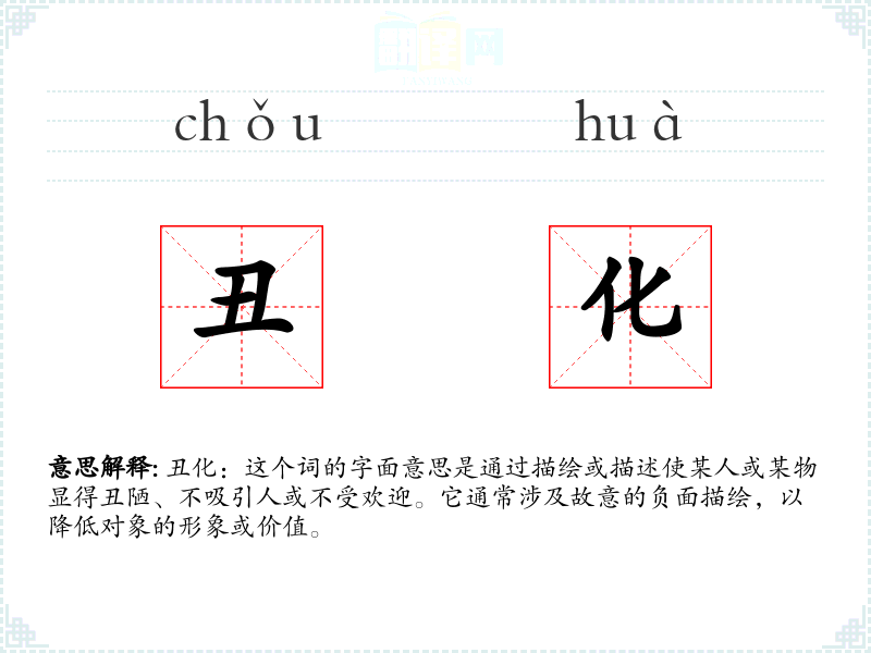 - 文学:在文学作品中,丑化可能用于塑造反面角色或突出主题,如通过丑化一个角色来展示其邪恶或不道德的行为。