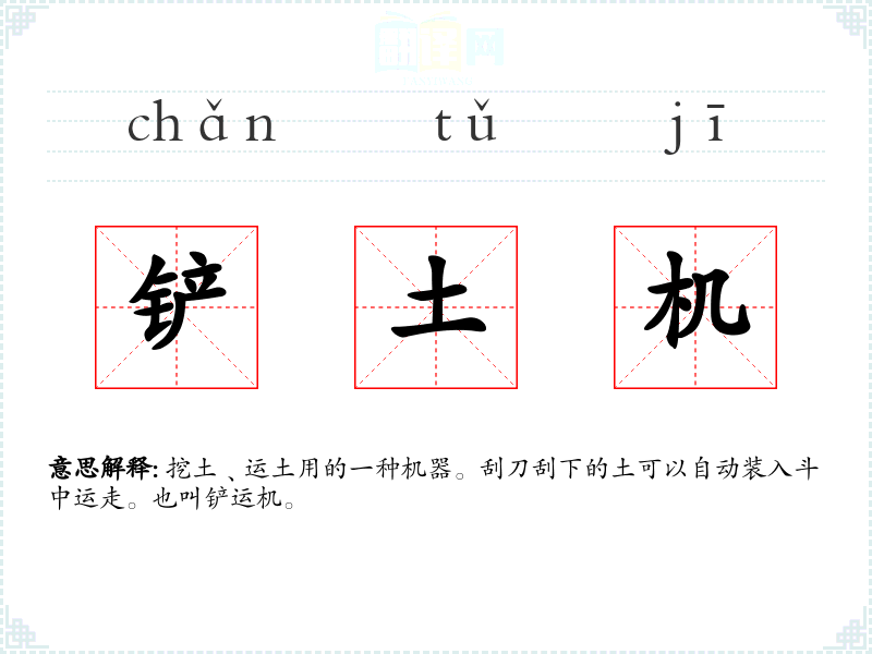 挖土﹑运土用的一种机器。刮刀刮下的土可以自动装入斗中运走。也叫铲运机。