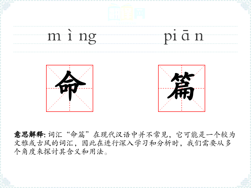 词汇“命篇”在现代汉语中并不常见,它可能是一个较为文雅或古风的词汇,因此在进行深入学*和分析时,我们需要从多个角度来探讨其含义和用法。