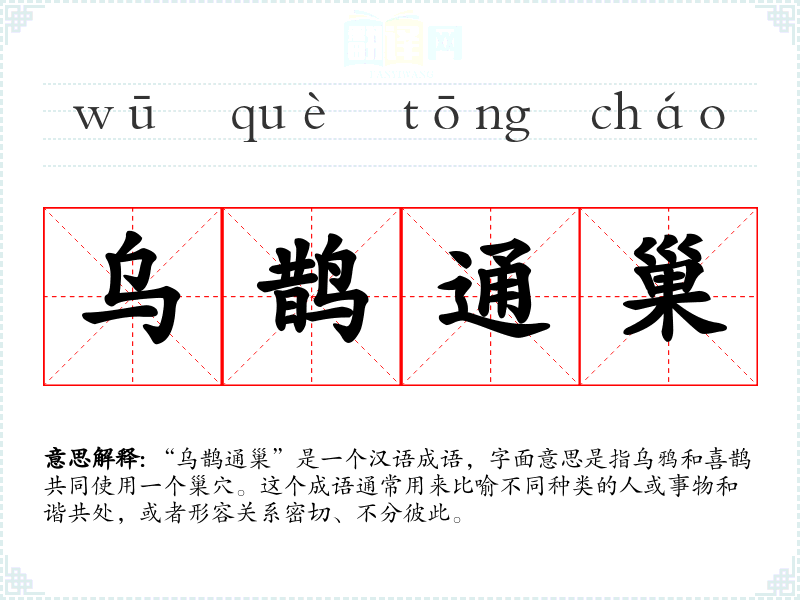 “乌鹊通巢”是一个汉语成语,字面意思是指乌鸦和喜鹊共同使用一个巢穴。这个成语通常用来比喻不同种类的人或事物和谐共处,或者形容关系密切、不分彼此。