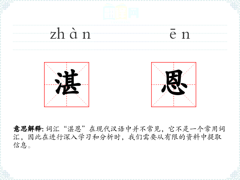 由于“湛恩”不是一个常用词汇,它在现代文学、口语或专业领域中很少出现。在古代文学作品中,可能会用来形容君主对臣子的深厚恩德,或者形容某人对另一人的极大恩惠。