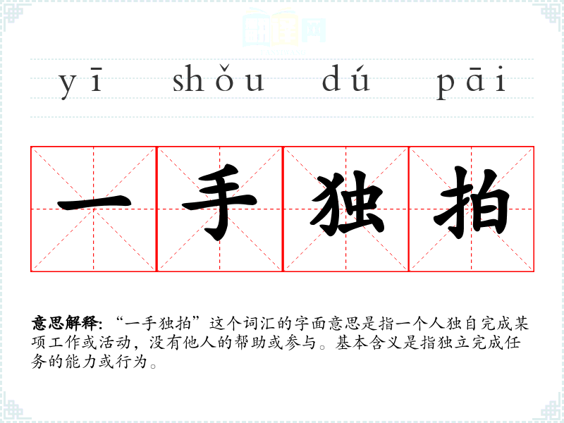 “一手独拍”这个词汇的字面意思是指一个人独自完成某项工作或活动,没有他人的帮助或参与。基本含义是指独立完成任务的能力或行为。