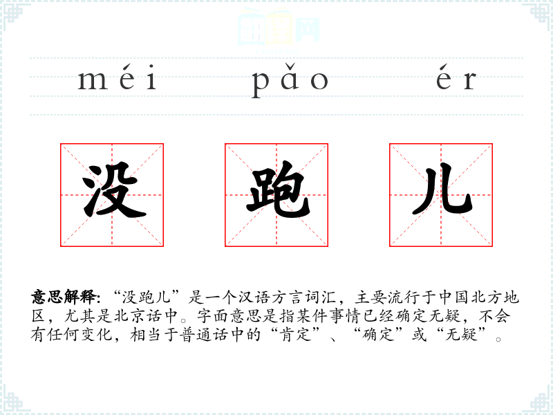 “没跑儿”是一个汉语方言词汇,主要流行于**北方地区,尤其是北京话中。字面意思是指某件事情已经确定无疑,不会有任何变化,相当于普通话中的“肯定”、“确定”或“无疑”。