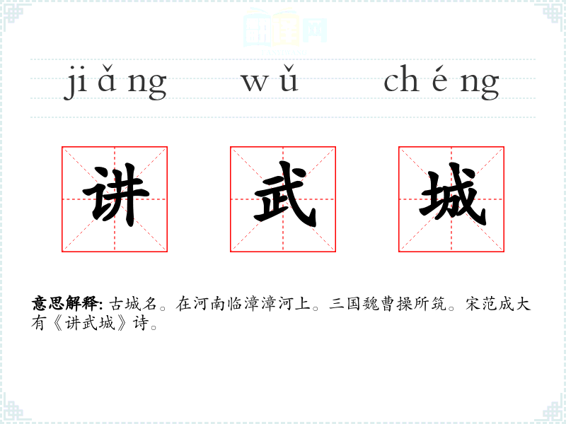 古城名。在河南临漳漳河上。三国魏曹操所筑。宋范成大有《讲武城》诗。