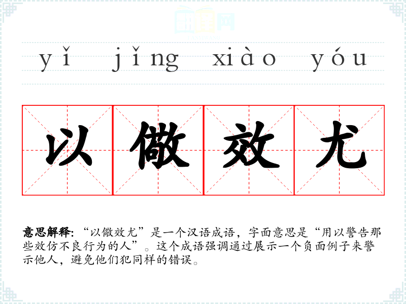 “以儆效尤”是一个汉语成语,字面意思是“用以警告那些效仿不良行为的人”。这个成语强调通过展示一个负面例子来警示他人,避免他们犯同样的错误。