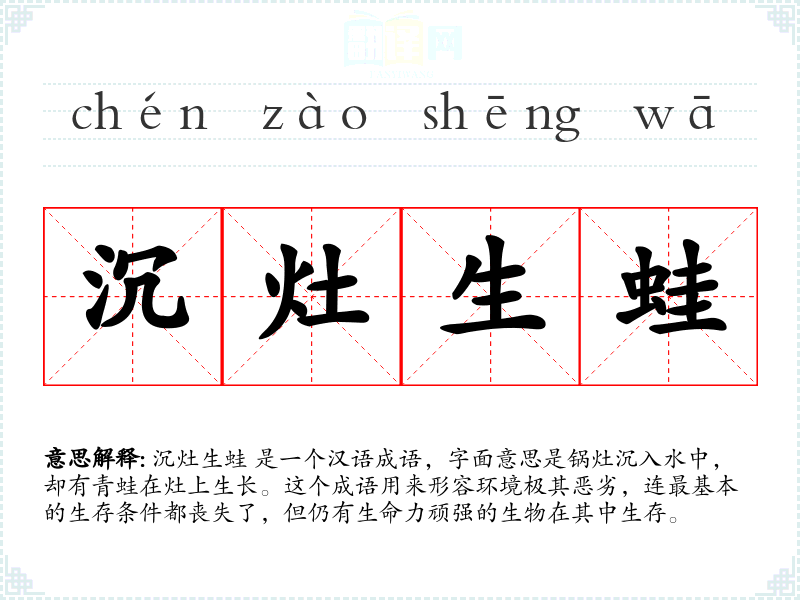 沉灶生蛙 是一个汉语成语,字面意思是锅灶沉入水中,却有青蛙在灶上生长。这个成语用来形容环境极其恶劣,连最基本的生存条件都丧失了,但仍有生命力顽强的生物在其中生存。