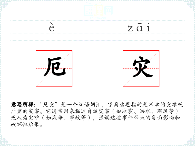 在英语中,“厄灾”可以对应为“calamity”或“catastrophe”,这些词汇同样强调了灾难的严重性和破坏性。不同文化对灾难的描述和应对方式可能有所不同,但“厄灾”所传达的负面情感是普遍存在的。