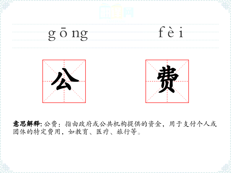 公费:指由政府或公共机构提供的资金,用于支付个人或团体的特定费用,如教育、医疗、旅行等。