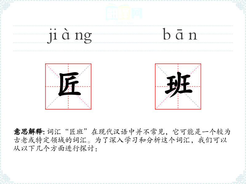 词汇“匠班”在现代汉语中并不常见,它可能是一个较为古老或特定领域的词汇。为了深入学*和分析这个词汇,我们可以从以下几个方面进行探讨: