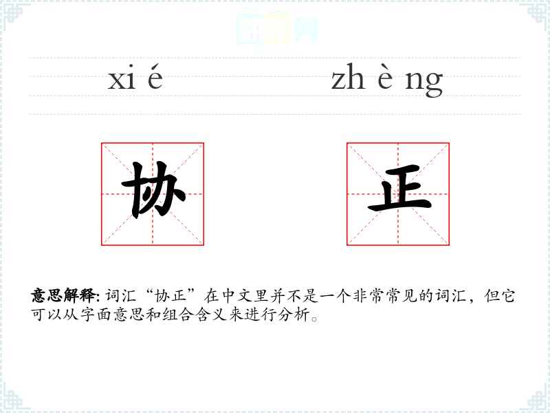 词汇“协正”在中文里并不是一个非常常见的词汇,但它可以从字面意思和组合含义来进行分析。