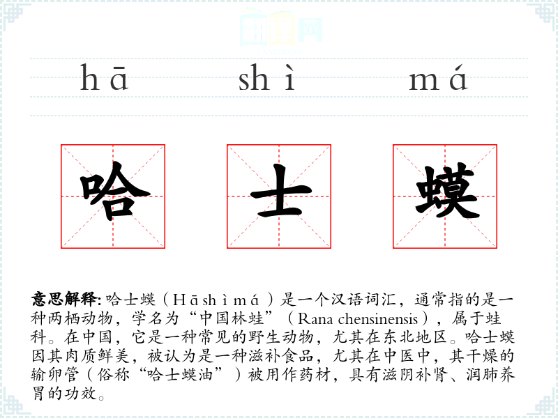 - 专业领域:在生物学和中医药领域,哈士蟆有其特定的科学名称和药用价值。