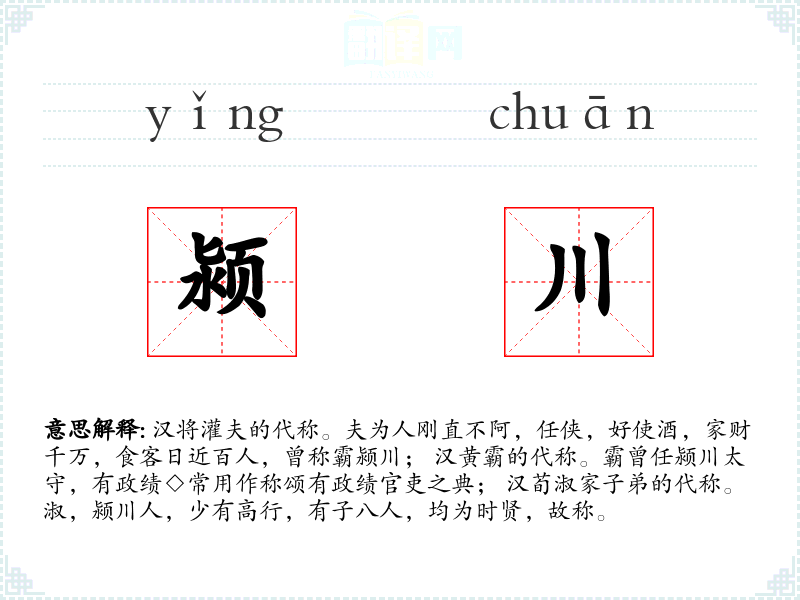 1.汉将灌夫的代称。夫为人刚直不阿,任侠,好使酒,家财千万,食客日近百人,曾称霸颍川; 汉黄霸的代称。霸曾任颍川太守,有政绩◇常用作称颂有政绩官吏之典; 汉荀淑家子弟的代称。淑,颍川人,少有高行,有子八人,均为时贤,故称。
