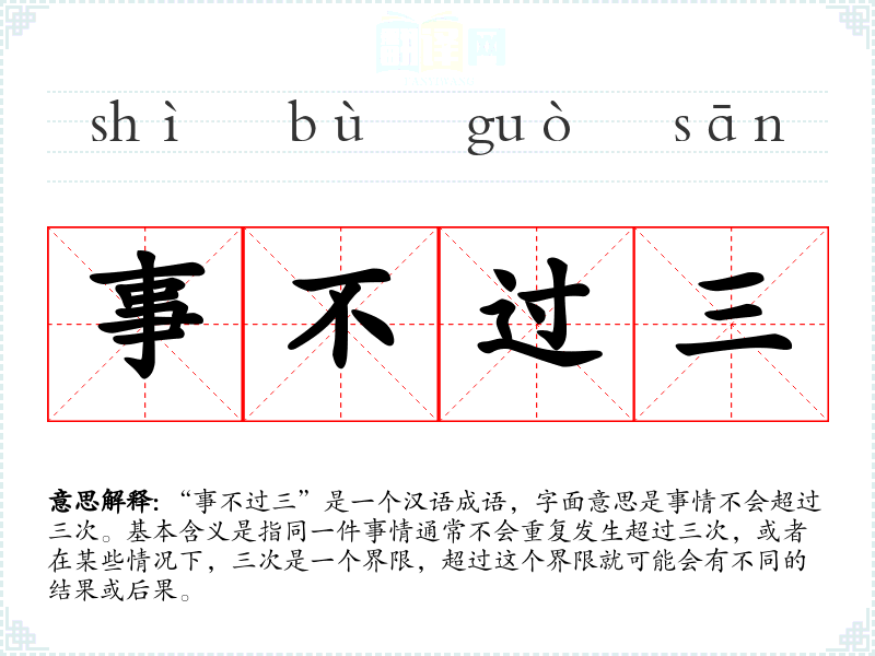 - 口语:在日常对话中,人们常用“事不过三”来警告或提醒对方,表示某件事情如果再发生就会采取行动。
