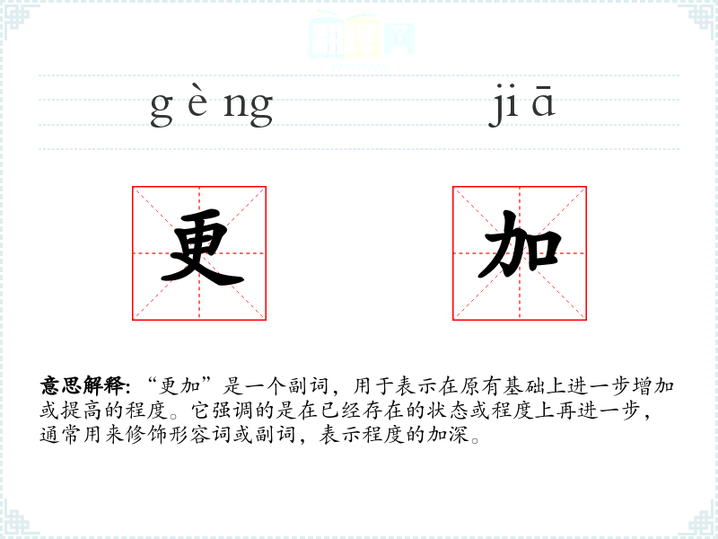 “更加”是一个副词,用于表示在原有基础上进一步增加或提高的程度。它强调的是在已经存在的状态或程度上再进一步,通常用来修饰形容词或副词,表示程度的加深。