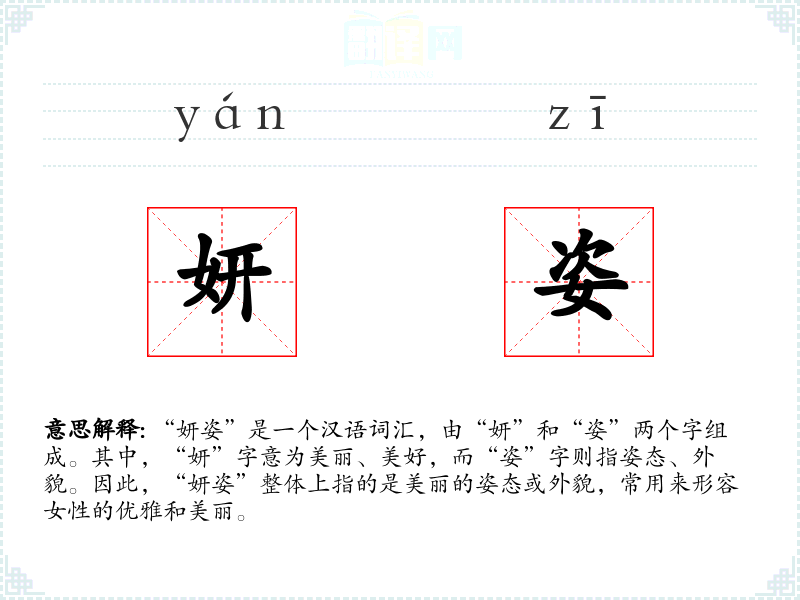 “妍”字最早见于《说文解字》,意为美丽。“姿”字则源于古代对姿态的描述。随着时间的推移,“妍姿”逐渐被用来形容女性的美丽和优雅。