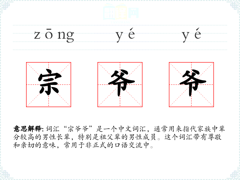 词汇“宗爷爷”是一个中文词汇,通常用来指代家族中辈分较高的男性长辈,特别是祖父辈的男性成员。这个词汇带有尊敬和亲切的意味,常用于非正式的口语交流中。