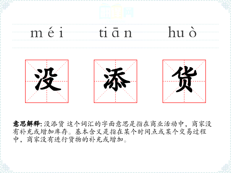 没添货 这个词汇是由“没”和“添货”两个词组合而成。其中,“没”表示否定,“添货”表示增加库存。在现代汉语中,这个词汇主要用于商业和日常交流中,描述库存状态。