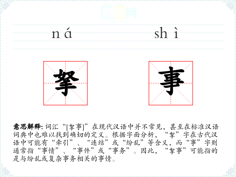 由于“挐事”不是一个常用词汇,其字面意思和基本含义难以确定。根据字面分析,它可能指的是与纷乱或复杂事务相关的事情。