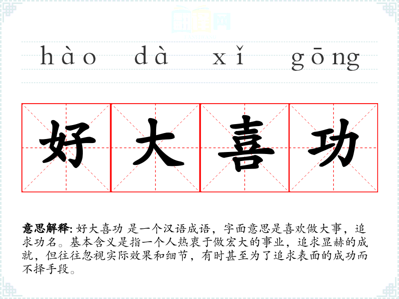 好大喜功 是一个汉语成语,字面意思是喜欢做大事,追求功名。基本含义是指一个人热衷于做宏大的事业,追求显赫的成就,但往往忽视实际效果和细节,有时甚至为了追求表面的成功而不择手段。