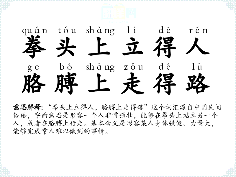 “拳头上立得人,胳膊上走得路”这个词汇源自**民间俗语,字面意思是形容一个人非常强壮,能够在拳头上站立另一个人,或者在胳膊上行走。基本含义是形容某人身体强健、力量大,能够完成常人难以做到的事情。