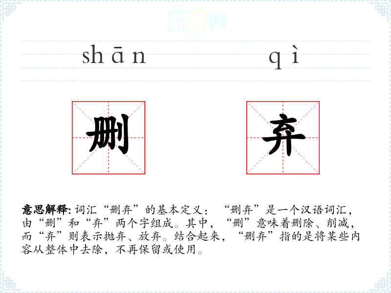 词汇“删弃”的基本定义: “删弃”是一个汉语词汇,由“删”和“弃”两个字组成。其中,“删”意味着删除、削减,而“弃”则表示抛弃、放弃。结合起来,“删弃”指的是将某些内容从整体中去除,不再保留或使用。