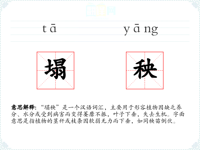 在文学作品中,“塌秧”常用来比喻人的精神状态不佳或事物的发展不如预期。在口语中,这个词可能用来形容任何事物状态不佳,不仅仅是植物。在农业或园艺专业领域,它则是一个描述植物健康状况的术语。