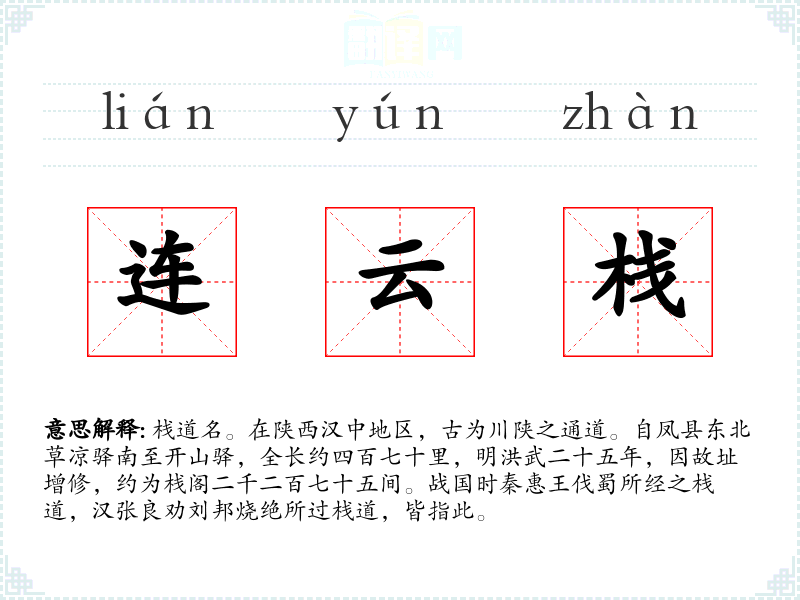 1.栈道名。在陕西汉中地区,古为川陕之通道。自凤县东北草凉驿南至开山驿,全长约四百七十里,明洪武二十五年,因故址增修,约为栈阁二千二百七十五间。战国时秦惠王伐蜀所经之栈道,汉张良劝刘邦烧绝所过栈道,皆指此。