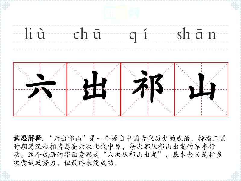 “六出祁山”是一个源自**古代历史的成语,特指三国时期蜀汉丞相诸葛亮六次北伐中原,每次都从祁山出发的军事行动。这个成语的字面意思是“六次从祁山出发”,基本含义是指多次尝试或努力,但最终未能成功。