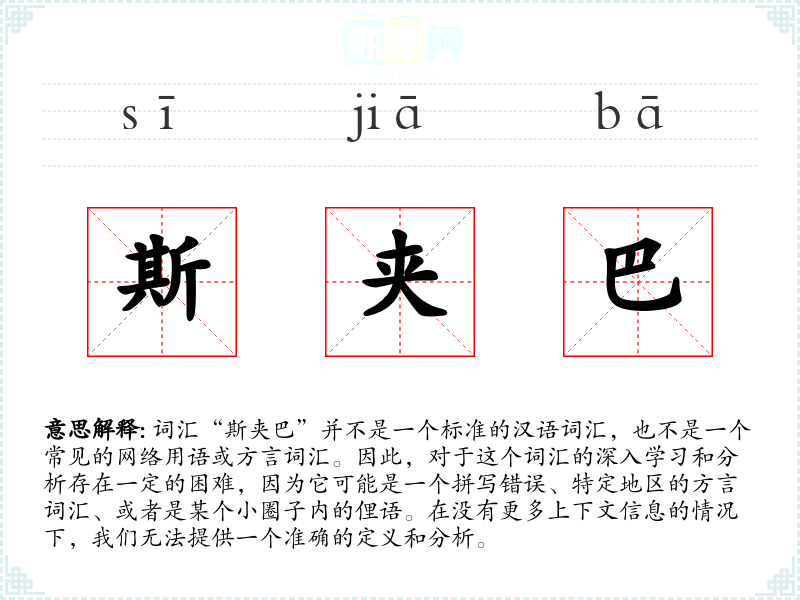 词汇“斯夹巴”并不是一个标准的汉语词汇,也不是一个常见的网络用语或方言词汇。因此,对于这个词汇的深入学习和分析存在一定的困难,因为它可能是一个拼写错误、特定地区的方言词汇、或者是某个小圈子内的俚语。在没有更多上下文信息的情况下,我们无法提供一个准确的定义和分析。