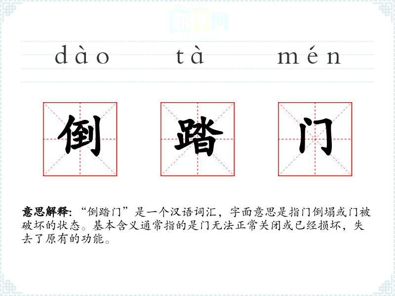 “倒踏门”是一个汉语词汇,字面意思是指门倒塌或门被破坏的状态。基本含义通常指的是门无法正常关闭或已经损坏,失去了原有的功能。