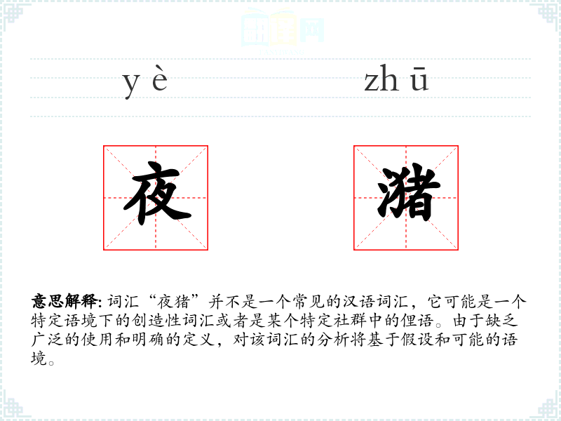 “夜猪”字面意思可能是指在夜间活动的猪。然而,由于这个词汇不常见,它可能被用作比喻或象征,例如指代夜间活动的人或某种夜间行为。