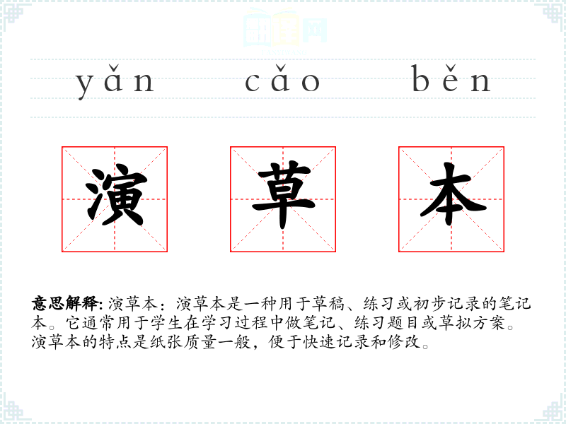 - 口语:在日常口语中,演草本常被提及作为学*工具,如“我需要一个新的演草本来做数学题”。
