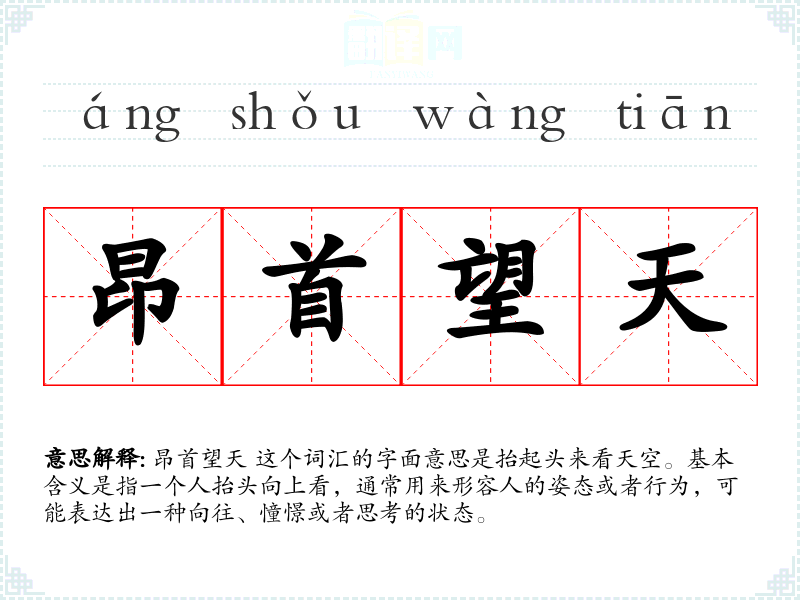 昂首望天 这个词汇的字面意思是抬起头来看天空。基本含义是指一个人抬头向上看,通常用来形容人的姿态或者行为,可能表达出一种向往、憧憬或者思考的状态。