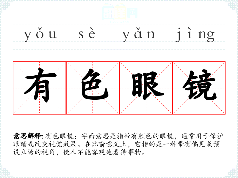 有色眼镜:字面意思是指带有颜色的眼镜,通常用于保护眼睛或改变视觉效果。在比喻意义上,它指的是一种带有偏见或预设立场的视角,使人不能客观地看待事物。