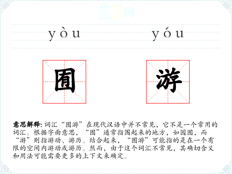 词汇“囿游”在现代汉语中并不常见,它不是一个常用的词汇。根据字面意思,“囿”通常指围起来的地方,如园囿,而“游”则指游动、游历。结合起来,“囿游”可能指的是在一个有限的空间内游动或游历。然而,由于这个词汇不常见,其确切含义和用法可能需要更多的上下文来确定。