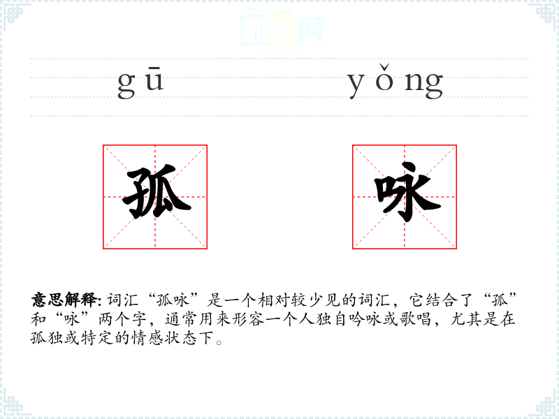 词汇“孤咏”是一个相对较少见的词汇,它结合了“孤”和“咏”两个字,通常用来形容一个人独自吟咏或歌唱,尤其是在孤独或特定的情感状态下。