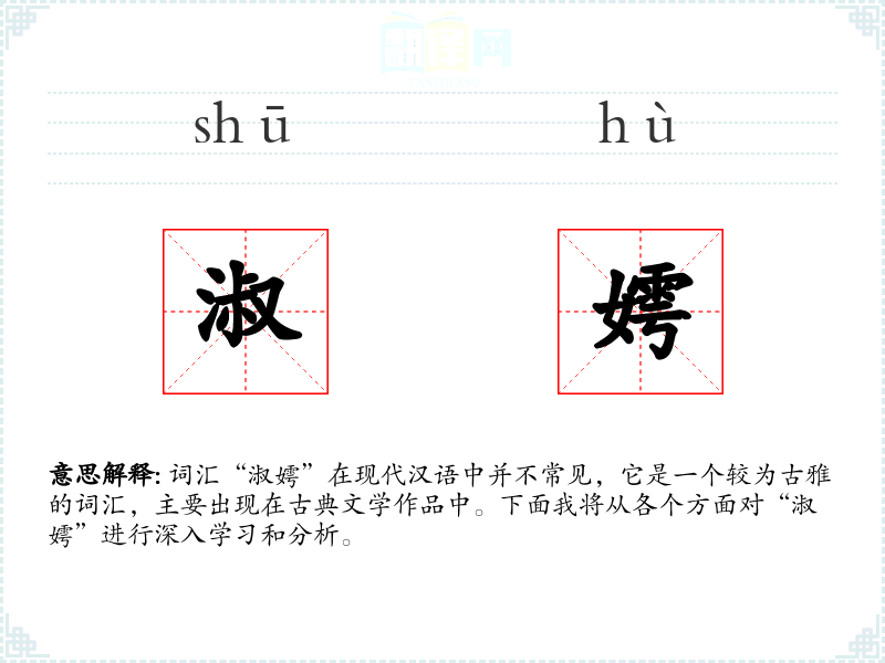 - “淑”字的基本含义是善良、美好,常用来形容女性的品德。