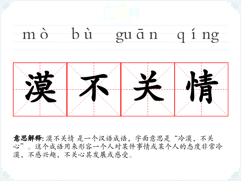 漠不关情 是一个汉语成语,字面意思是“冷漠,不关心”。这个成语用来形容一个人对某件事情或某个人的态度非常冷漠,不感兴趣,不关心其发展或感受。